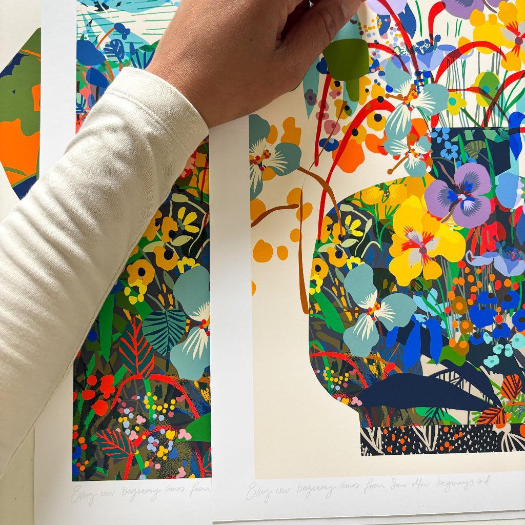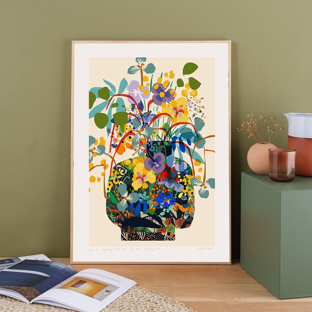 Celebrate the beauty of change and the quiet poetry of nature with Every New Beginning Comes from Another Beginning’s End  a new fine art print by Kitty McCall. Available in two designs, this concept unfolds across a vibrant landscape and its floral counterpart: one bursting with abstract tropical growth, the other a vase arrangement gathered from that imagined world. Each artwork tells its own story, while together they speak to the cycles of transformation, renewal, and creative evolution.