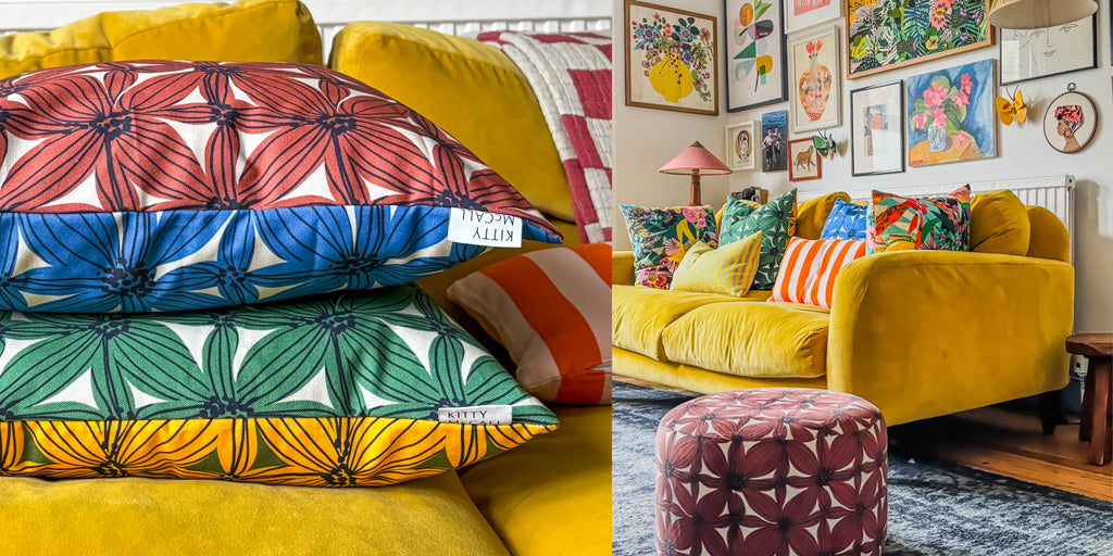 Each fabric is printed to order in the UK, ensuring no waste and the highest quality. Choose cushions or fabric by the metre, and order swatches to see colours in your own home before you commit.